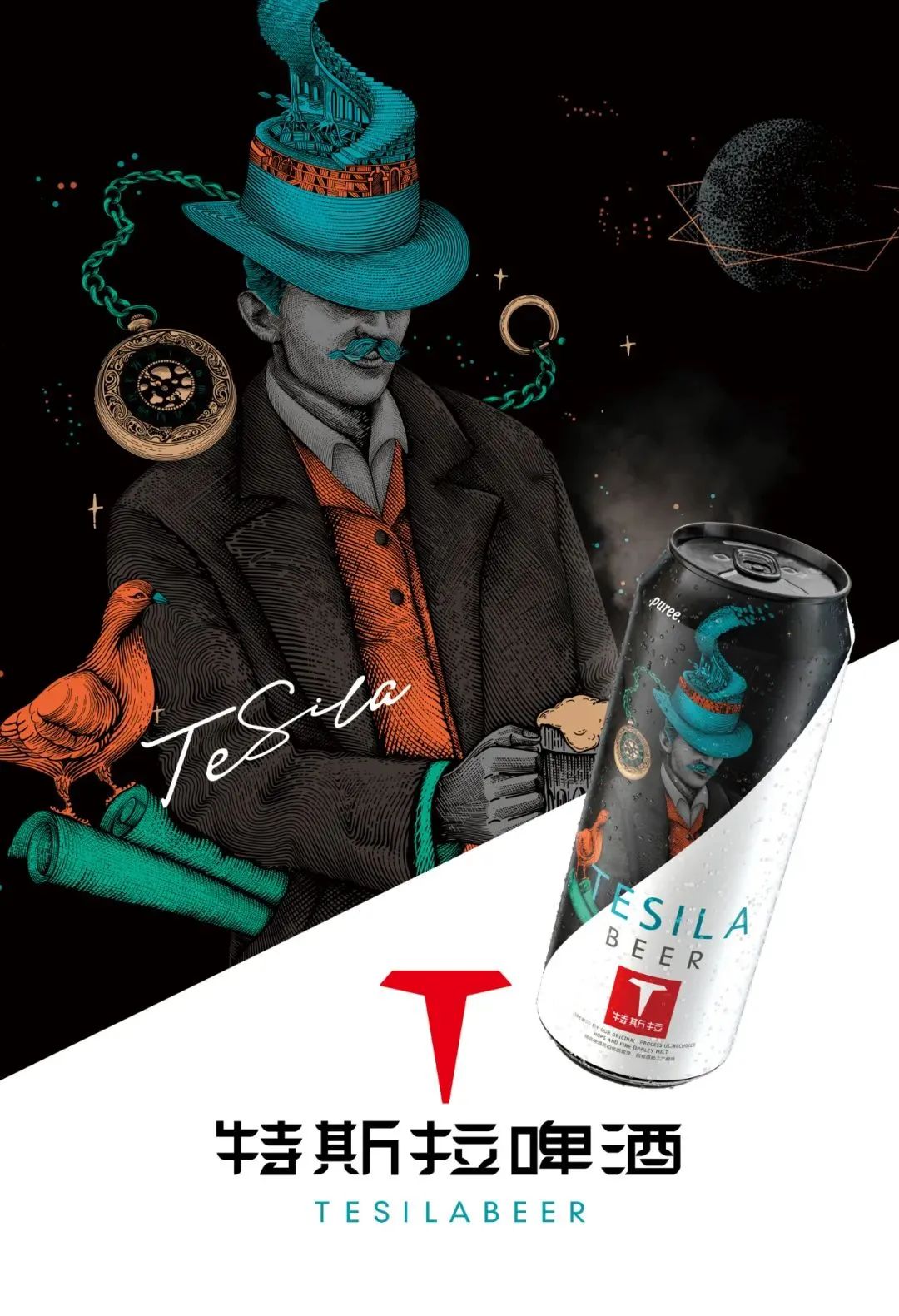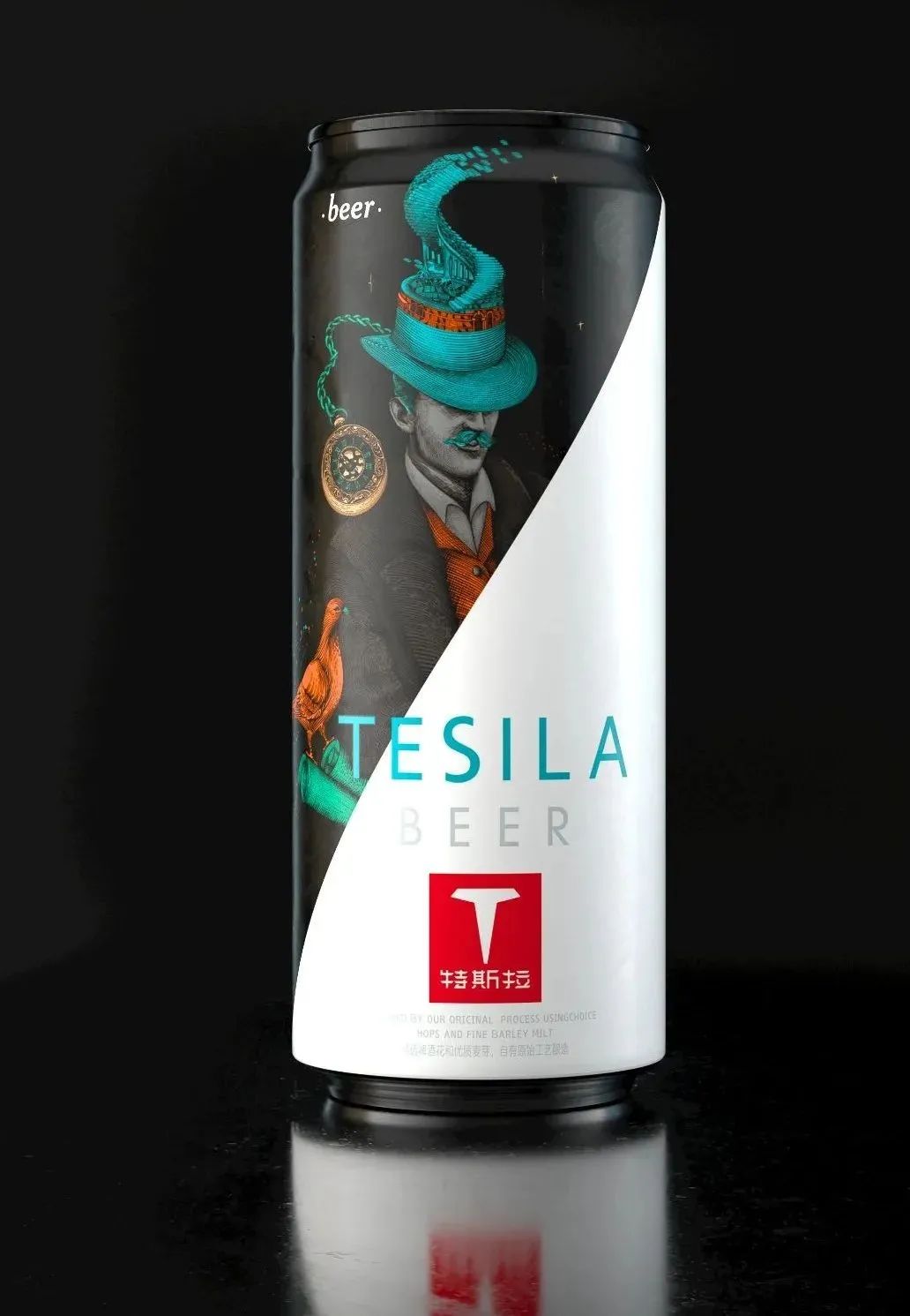 我們注意到,特斯拉啤酒去年還設(shè)計(jì)了一款新包裝。在創(chuàng)作過(guò)程還借助科學(xué)家“特斯拉”為視覺(jué)原型再創(chuàng)作,以此轉(zhuǎn)化為品牌專屬視覺(jué),暗示靈感來(lái)自科學(xué)家“特斯拉”。
