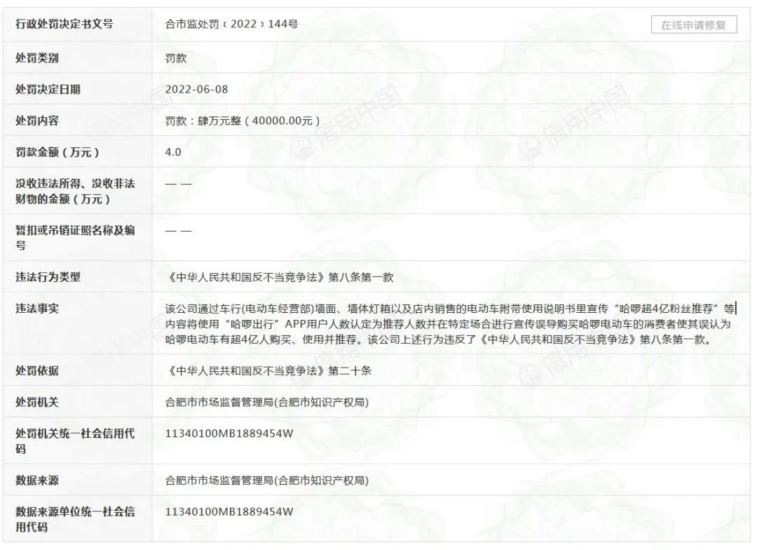 據(jù)信用中國(guó)顯示,哈啰通過(guò)車行(電動(dòng)車經(jīng)營(yíng)部)墻面、墻體燈箱以及店內(nèi)銷售的電動(dòng)車附帶使用說(shuō)明書(shū)里宣傳“哈啰超4億粉絲推薦”等內(nèi)容,將使用“哈啰出行”APP用戶人數(shù)認(rèn)定為推薦人數(shù),并在特定場(chǎng)合進(jìn)行宣傳,使消費(fèi)者誤認(rèn)為哈啰電動(dòng)車有超4億人購(gòu)買、使用并推薦。