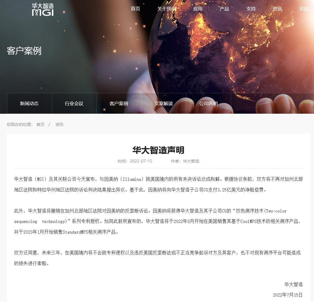 7月15日,深圳華大集團旗下的深圳華大智造科技股份有限公司(下稱“華大智造”,MGI)宣布,該公司與全球基因測序儀巨頭因美納(Illumina)就美國境內(nèi)的所有未決訴訟達(dá)成和解。