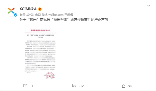 8月1日,極米通過官方平臺,發(fā)布了一則《關于“極米”商標被“極米堅果”惡意侵權事件》的嚴正聲明。作為國內(nèi)投影儀行業(yè)的領頭羊企業(yè),極米的聲明立即引發(fā)廣大網(wǎng)友的關注。
