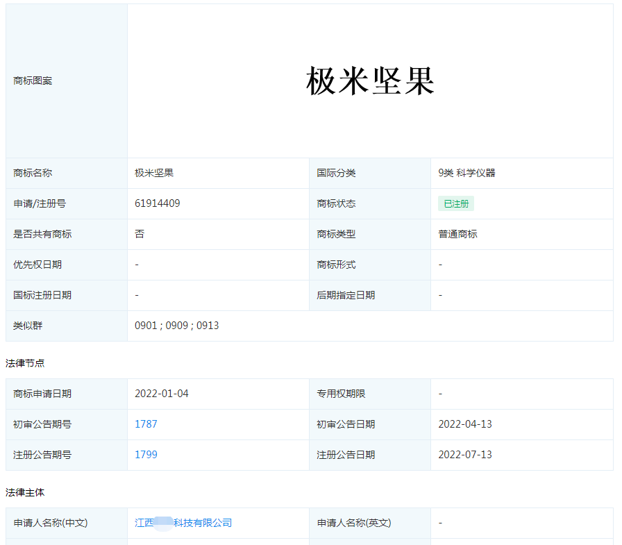 通過查詢發(fā)現(xiàn),涉及投影儀的第9類“極米堅果”商標在2022年1月4日被江西某科技公司申請注冊,并于7月13日注冊完成,另外,該公司還對“極米堅果”商標進行了大量布局,幾乎覆蓋了所有類別,而這也是某電商平臺審核通過的重要原因。