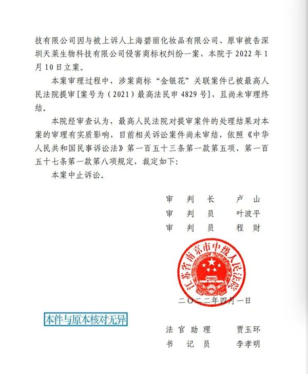 如4月1日,江蘇南京中院基于“金銀花”關(guān)聯(lián)案件已被最高法提審,決定中止審理上訴人南京三盾藥業(yè)有限公司、青島海氏海諾英諾威消毒科技有限公司與被上訴人上海碧麗化妝品有限公司案。“最高人民法院對(duì)提審案件的處理結(jié)果對(duì)本案的審理有實(shí)質(zhì)影響,目前相關(guān)訴訟案件尚未審結(jié),依法裁定本案中止訴訟。”裁定書稱。