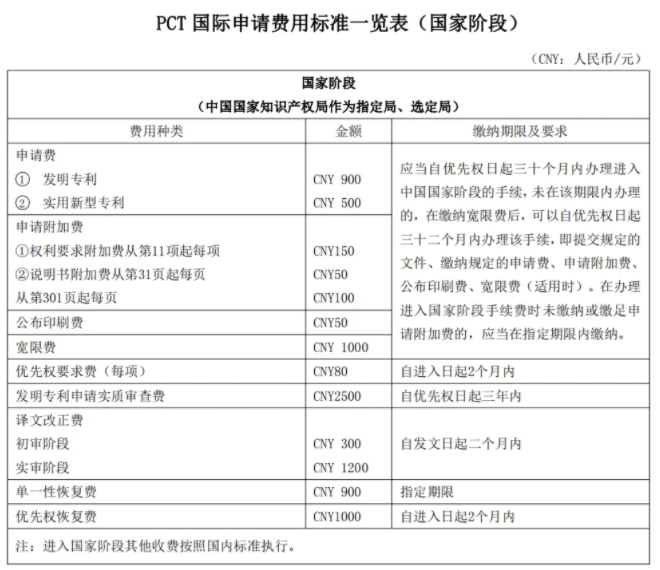 PCT國家階段(中國國家知識(shí)產(chǎn)權(quán)局作為指定局、選定局)繳納的費(fèi)用包括申請(qǐng)費(fèi)、申請(qǐng)附 加費(fèi)、公布印刷費(fèi)、優(yōu)先權(quán)要求費(fèi)、寬限費(fèi)、發(fā)明專利申請(qǐng)實(shí)質(zhì)審查費(fèi)、譯文改正費(fèi)、單一性恢復(fù)費(fèi)、優(yōu)先權(quán)恢復(fù)費(fèi)。進(jìn)入國家階段其他收費(fèi)按照國內(nèi)標(biāo)準(zhǔn)執(zhí)行。