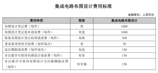 集成電路布圖設(shè)計(jì)的費(fèi)用種類包括布圖設(shè)計(jì)登記費(fèi)、布圖設(shè)計(jì)登記復(fù)審請(qǐng)求費(fèi)、恢復(fù)布圖設(shè)計(jì)登記權(quán)利請(qǐng)求費(fèi)、著錄事項(xiàng)變更手續(xù)費(fèi)、延長期限請(qǐng)求費(fèi)、非自愿許可使用布圖設(shè)計(jì)請(qǐng)求費(fèi)、非自愿許可使用布圖設(shè)計(jì)支付報(bào)酬裁決費(fèi)。