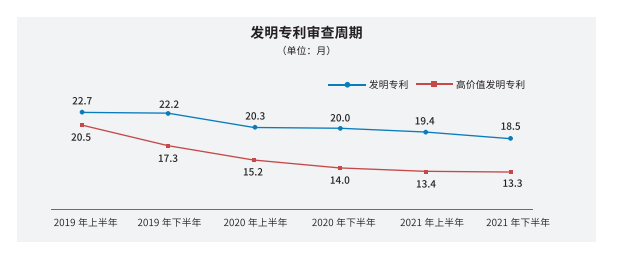 加強審查階段的周期過程管理,調(diào)配優(yōu)勢資源向高價值專利傾斜,持續(xù)推進專利審查提質(zhì)增效。2021年,高價值發(fā)明專利審查周期壓減至 13.3個月,提前完成國務(wù)院深化"放管服"改革任務(wù)目標(biāo),發(fā)明專利平均審查周期壓減至18.5個月。開展長周期案件專項清理工作,全年審結(jié)長周期案件21.7萬件。扎實落實《提升發(fā)明專利審查質(zhì)量和審查效率專項實施方案2019-2022年)》工作部署,嚴格依法審查,把好授權(quán)確權(quán)關(guān),持續(xù)提高審查質(zhì)量和審查效率。2021年度專利審查質(zhì)量用戶瀟意度指數(shù)為85.7,連續(xù)12年保持在滿意區(qū)間。