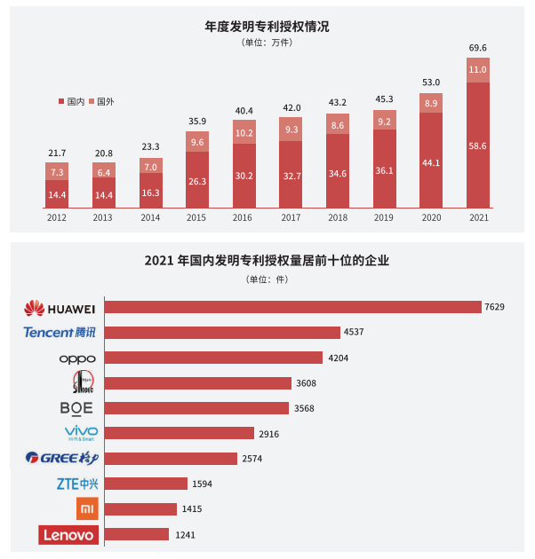 2021年我國發(fā)明專利申請量為158.6萬件,同比增長5.9%;授權(quán)發(fā)明專利69.6萬件,同比增長31.3%。