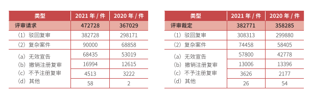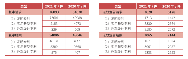2021年,共受理專利復(fù)審請求7.6萬件,同比增長39.2%;結(jié)案5.4萬件,同比增長12.4%。復(fù)審請求的結(jié)案周期平均為16.4個月。審結(jié)的發(fā)明專利復(fù)審案件中,撤銷駁回占47.2%、維持駁回和其他方式結(jié)案占52.8%。