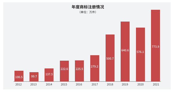 2021年,商標(biāo)注冊量為773.9萬件,同比增加 34.3%。其中國內(nèi)商標(biāo)注冊754.5萬件,占總量的97.5%,同比增長35.3%;國外在華商標(biāo)注冊19.4萬件,占總量的 2.5%,同比增長5.2%。