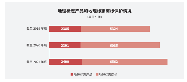 2021年,受理地理標(biāo)志產(chǎn)品保護申請22 個,批準保護地理標(biāo)志產(chǎn)品99個,核準使用地理標(biāo)志產(chǎn)品專用標(biāo)志市場主體7677家。截至2021年底,累計批準地理標(biāo)志產(chǎn)品2490個,核準地理標(biāo)志專用標(biāo)志市場主體 1.7萬家。