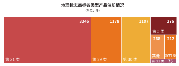 已注冊的地理標(biāo)志商標(biāo)中,用于第 31類(農(nóng)產(chǎn)品、新鮮水果蔬菜等)商品的數(shù)量最多,共3346件,占全部地理標(biāo)志商標(biāo)的51.0%;其次分別是用于第 29類(肉、魚、蛋、奶等)產(chǎn)品和用于第30類(咖啡、茶、米、蜂蜜等)產(chǎn)品,分別為1178件和1107件,占比 18.0%和16.9%。數(shù)據(jù)表明地理標(biāo)志商標(biāo)主要注冊在農(nóng)產(chǎn)品及其初級加工品、中藥材、茶葉和瓷器等,其與農(nóng)業(yè)的關(guān)系最緊密。