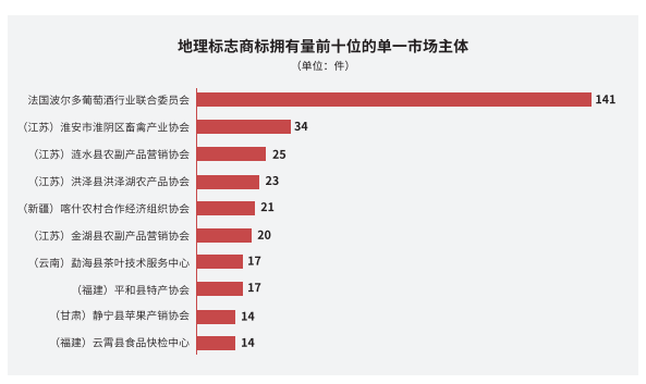 單一市場主體擁有地理標(biāo)志商標(biāo)數(shù)量排名前十位的分別是法國波爾多葡萄酒行業(yè)聯(lián)合委員會 (141件)、淮安市淮陰區(qū)畜離產(chǎn)業(yè)協(xié)會(江蘇,34件)、漣水縣農(nóng)副產(chǎn)品營銷協(xié)會(江蘇,25件)、洪澤縣洪澤湖農(nóng)產(chǎn)品協(xié)會(江蘇,23 件)、喀什農(nóng)村合作經(jīng)濟組織協(xié)會(新疆;21件)、金湖縣農(nóng)副產(chǎn)品營銷協(xié)會(江蘇,20件)、勐??h茶葉技術(shù)服務(wù)中心(云南,17 件)、平和縣特產(chǎn)協(xié)會(福建,17 件)、靜寧縣蘋果產(chǎn)銷協(xié)會(甘肅,14件)和云霄縣食品快檢中心(福建,14件)。