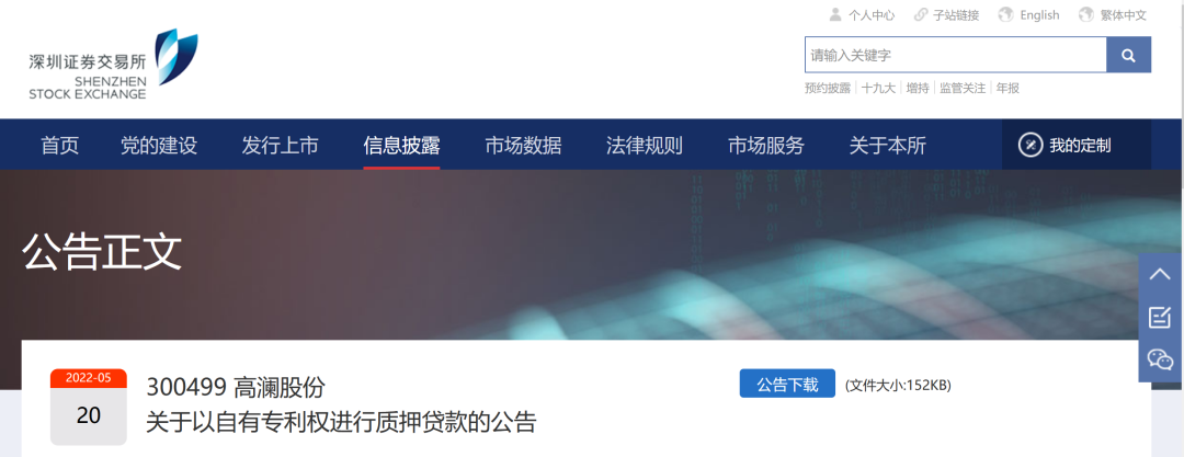 附:高瀾股份關(guān)于以自有專利權(quán)進(jìn)行質(zhì)押貸款的公告原文
