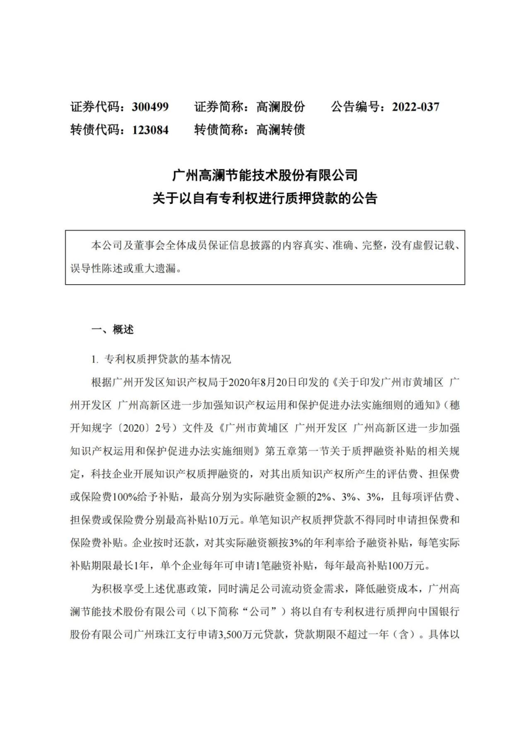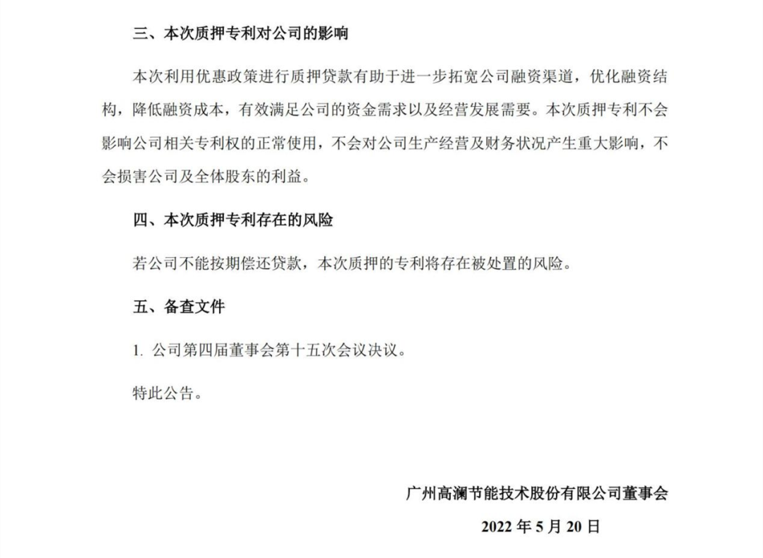 近日,廣州高瀾節(jié)能技術(shù)股份有限公司(以下簡(jiǎn)稱“高瀾股份”)發(fā)布了關(guān)于以自有專利權(quán)進(jìn)行質(zhì)押貸款的公告,引起了業(yè)內(nèi)不少關(guān)注。在公告中,高瀾股份表示,為了滿足公司流動(dòng)資金需求,降低融資成本,公司將以自有專利權(quán)進(jìn)行質(zhì)押向中國(guó)銀行股份有限公司廣州珠江支行申請(qǐng)3500萬(wàn)元貸款,貸款期限不超過(guò)一年(含)。