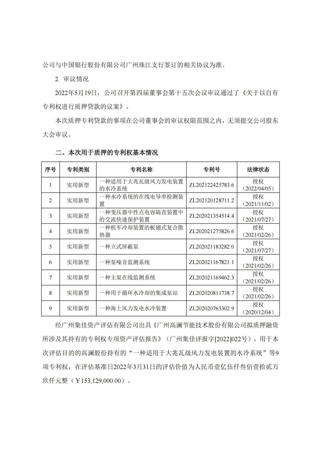 經(jīng)廣州集佳資產(chǎn)評(píng)估有限公司出具《廣州高瀾節(jié)能技術(shù)股份有限公司擬質(zhì)押融資所涉及其持有的專利權(quán)專項(xiàng)資產(chǎn)評(píng)估報(bào)告》(廣州集佳評(píng)報(bào)字[2022]022號(hào)),用于本次評(píng)估目的的高瀾股份持有的“一種適用于大兆瓦級(jí)風(fēng)力發(fā)電裝置的水冷系統(tǒng)”等9項(xiàng)專利權(quán),在評(píng)估基準(zhǔn)日2022年3月31日的評(píng)估價(jià)值為人民幣壹億伍仟叁佰壹拾貳萬(wàn)玖仟元整(¥153,129,000.00)。