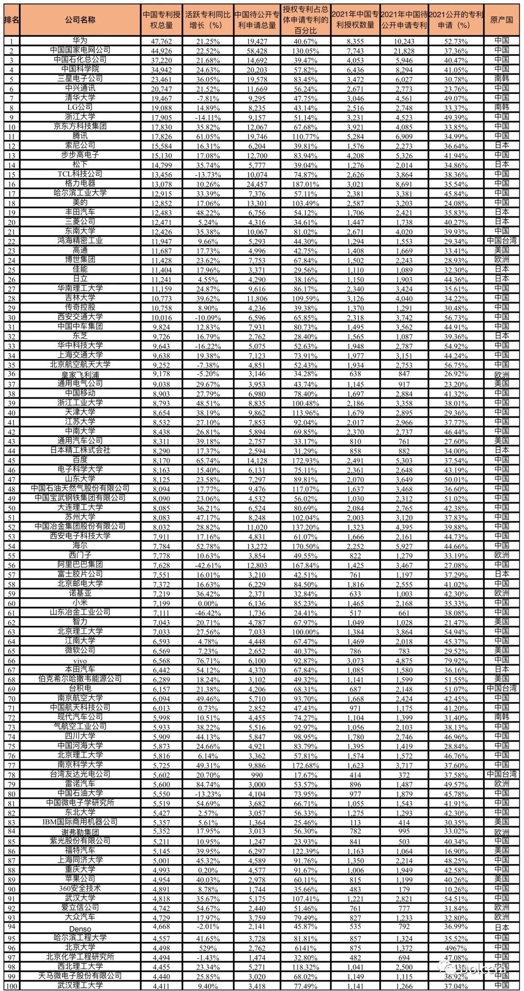IAM雜志:2021年中國專利100強