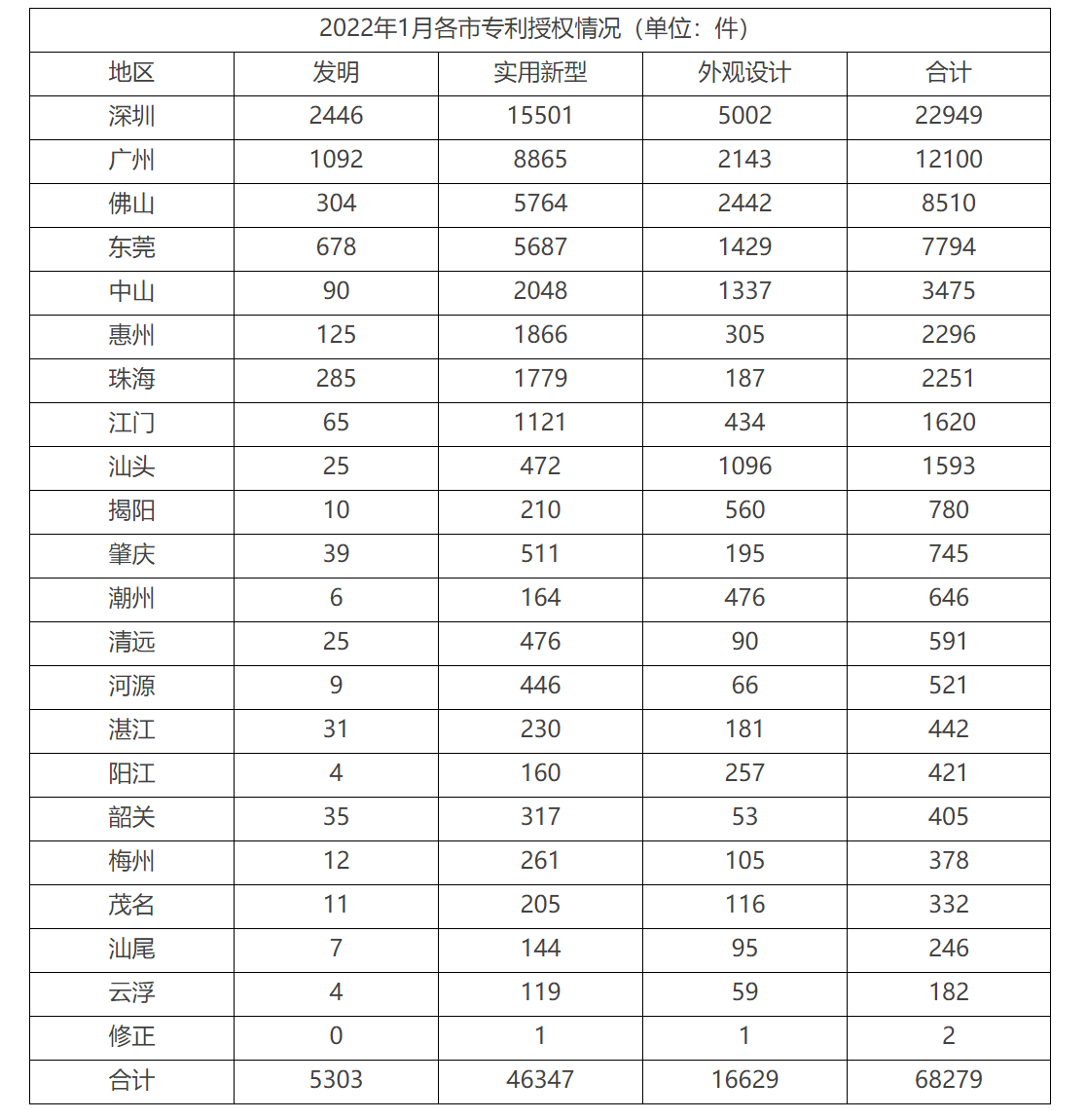 2022年1月各市專利授權(quán)情況