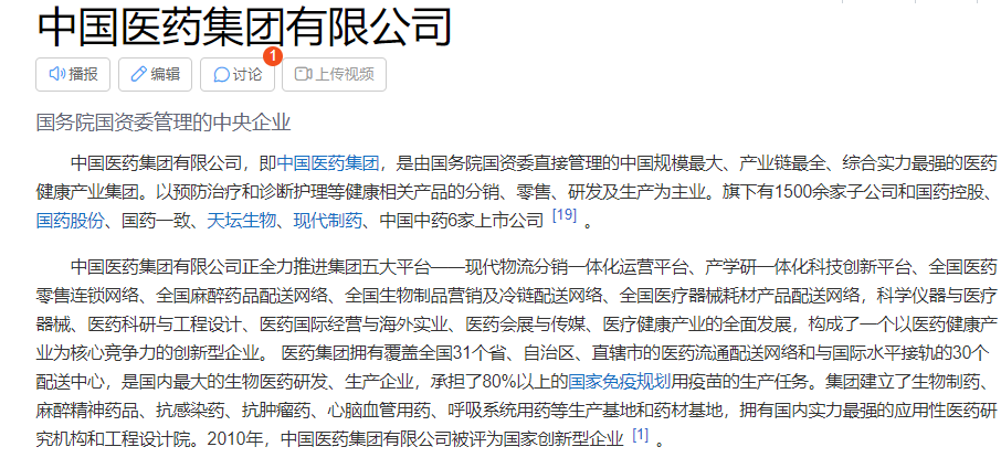 那么,國(guó)藥集團(tuán)、中國(guó)生物呢?百度百科資料顯示,中國(guó)醫(yī)藥集團(tuán)有限公司(簡(jiǎn)稱“國(guó)藥集團(tuán)”),是由國(guó)務(wù)院國(guó)資委直接管理的中國(guó)規(guī)模最大、產(chǎn)業(yè)鏈最全、綜合實(shí)力最強(qiáng)的醫(yī)藥健康產(chǎn)業(yè)集團(tuán)。