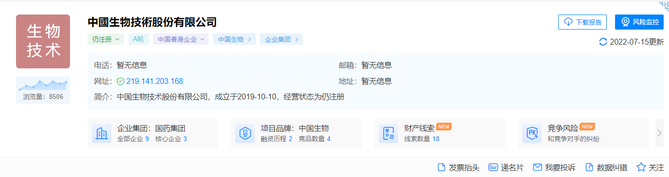 企查查顯示,中國(guó)生物技術(shù)股份有限公司(“中國(guó)生物”)始于1919年,前身為北洋政府中央防疫處,新中國(guó)成立后直屬衛(wèi)生部領(lǐng)導(dǎo),現(xiàn)為世界500強(qiáng)中國(guó)醫(yī)藥集團(tuán)有限公司的重要成員企業(yè),是中國(guó)歷史悠久、產(chǎn)品全、規(guī)模大,集科研、生產(chǎn)、銷售以及研究生培養(yǎng)為一體的綜合性生物制藥企業(yè)。