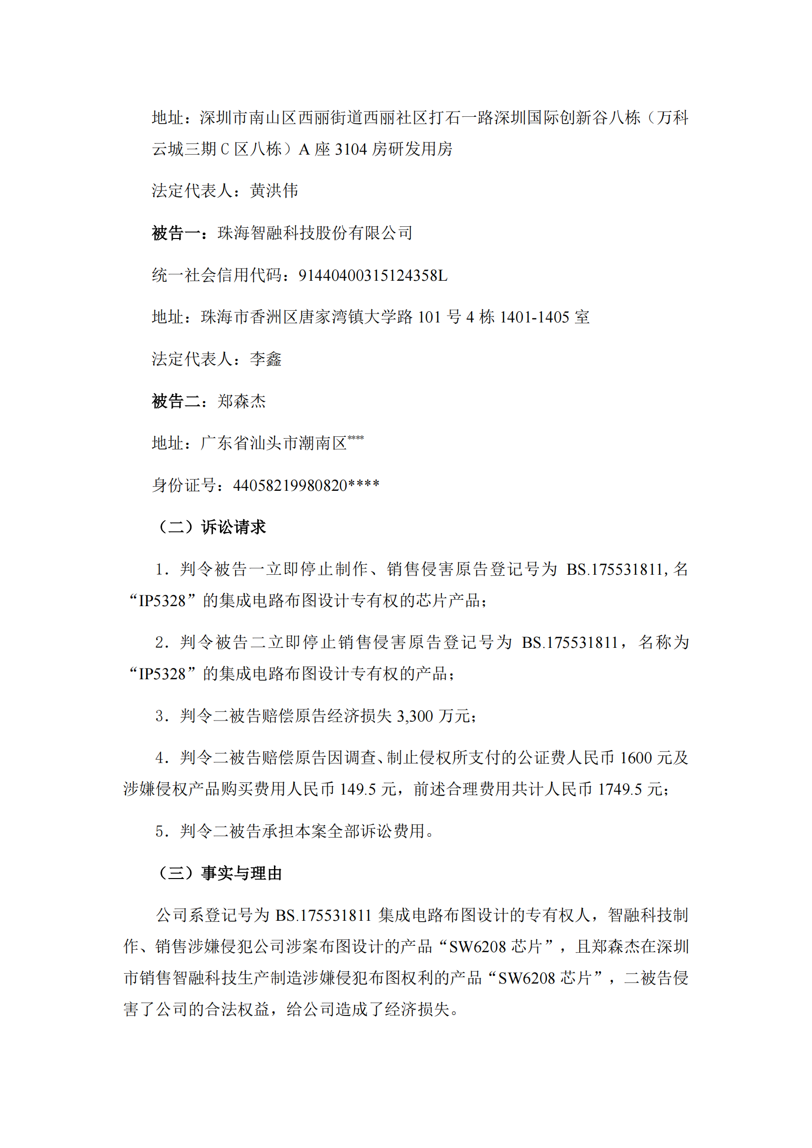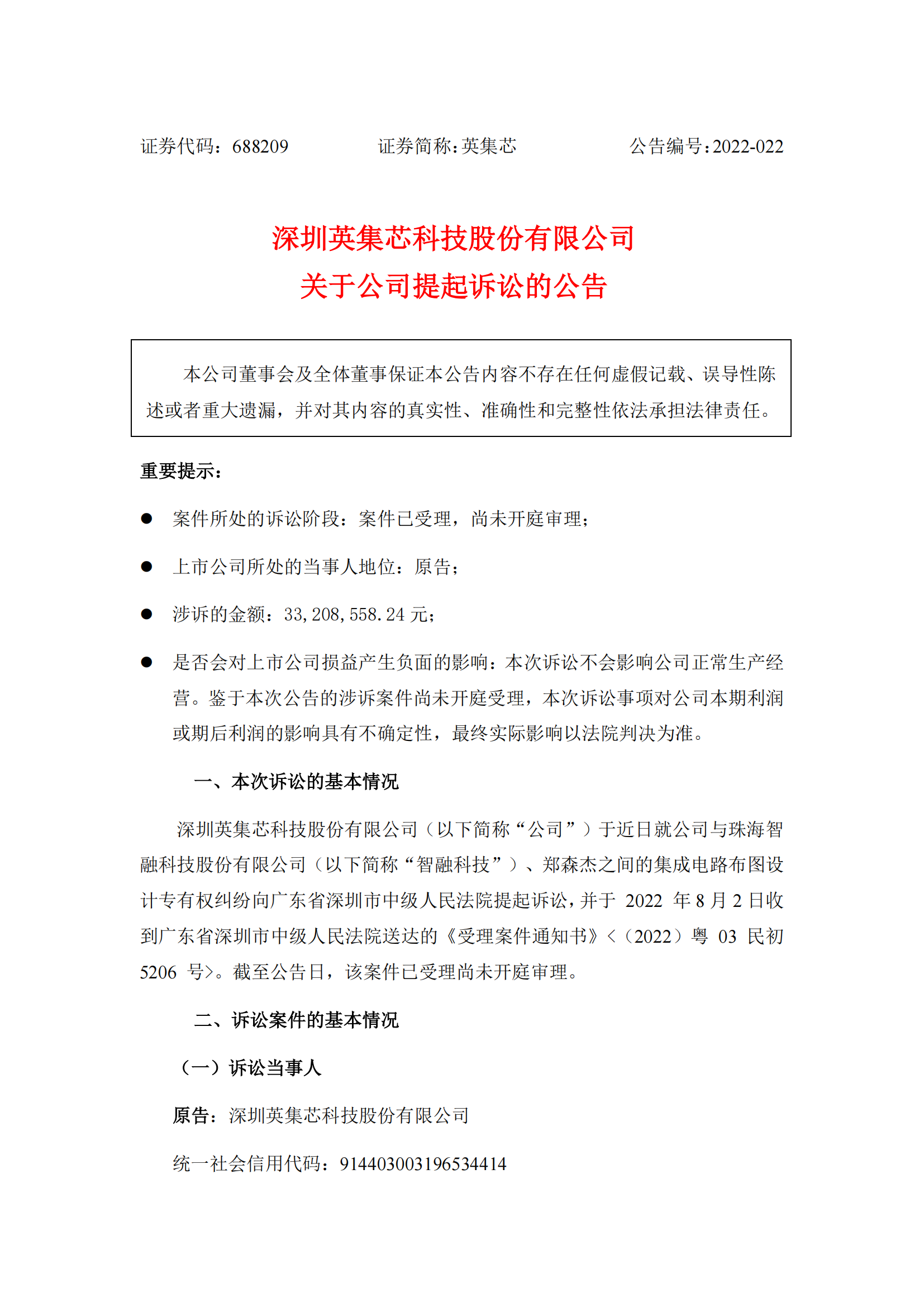 “英集芯就公司與珠海智融科技、鄭森杰之間的集成電路布圖設(shè)計(jì)專有權(quán)糾紛向廣東省深圳市中級人民法院提起訴訟,涉訴金額約3320.86萬元;并于2022年8月2日收到廣東省深圳市中級人民法院送達(dá)的《受理案件通知書》<(2022)粵03民初5206號>。截至公告日,該案件已受理尚未開庭審理。