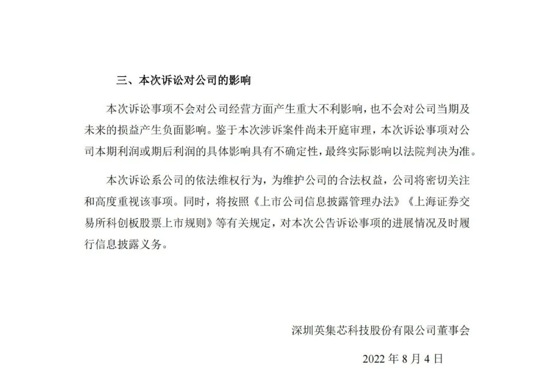 “英集芯就公司與珠海智融科技、鄭森杰之間的集成電路布圖設(shè)計(jì)專有權(quán)糾紛向廣東省深圳市中級人民法院提起訴訟,涉訴金額約3320.86萬元;并于2022年8月2日收到廣東省深圳市中級人民法院送達(dá)的《受理案件通知書》<(2022)粵03民初5206號>。截至公告日,該案件已受理尚未開庭審理。”