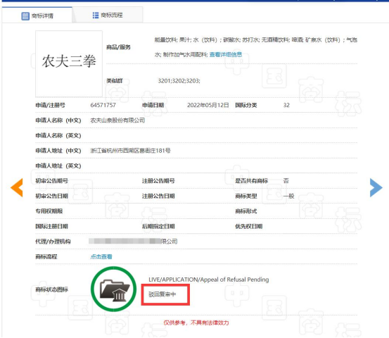 國(guó)家知識(shí)產(chǎn)權(quán)局商標(biāo)局披露信息顯示,農(nóng)夫山泉于2021年7月7日共申請(qǐng)了4件“農(nóng)夫三拳”商標(biāo),國(guó)際分類依次為29、30、31、32,但均被駁回。 當(dāng)大家都以為農(nóng)夫山泉已經(jīng)放棄“農(nóng)夫三拳”商標(biāo)的時(shí)候,農(nóng)夫山泉公司再度出手了!