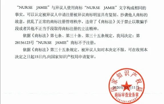 被異議人在異議人具有知名的前提下申請(qǐng)注冊(cè)被異議商標(biāo),完全構(gòu)成惡意性。“nurse jamie”并非固定搭配,而是由異議人獨(dú)創(chuàng)而成,具有較高的獨(dú)創(chuàng)性,他人善意巧合取得的可能性極低。