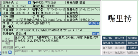 經(jīng)查詢,海底撈最早申請(qǐng)“嘴里撈”是在2020年11月,今年1月份又補(bǔ)充提交了3件,目前均已成功注冊(cè)。