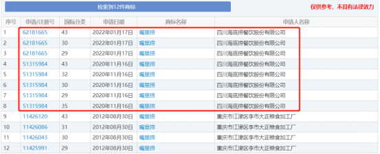 值得一提的是,早在海底撈出手申請(qǐng)之前,重慶一家公司就于2012年申請(qǐng)了4件“嘴里撈”商標(biāo),不過(guò)知協(xié)查詢發(fā)現(xiàn),目前其中3件和海底撈屬于相同類別的都已經(jīng)無(wú)效,只剩下1件31類的還處于有效期內(nèi)。