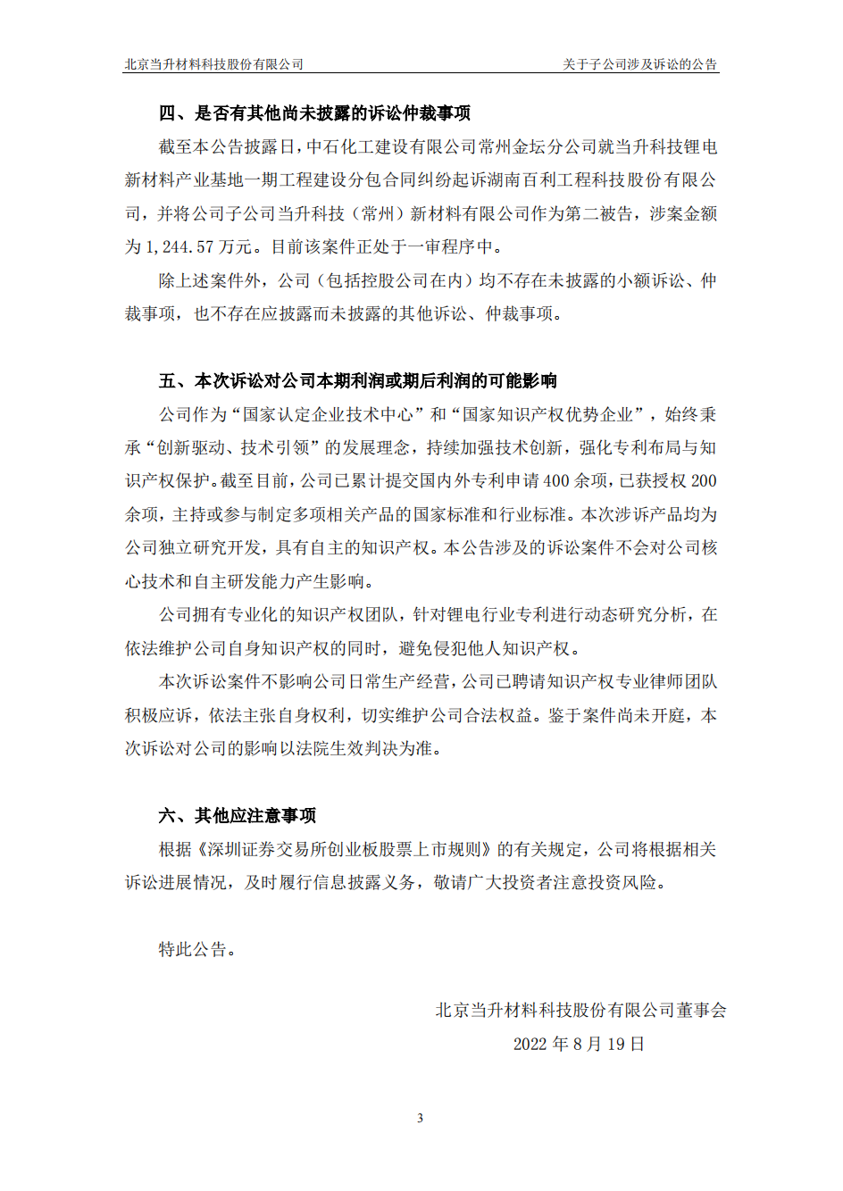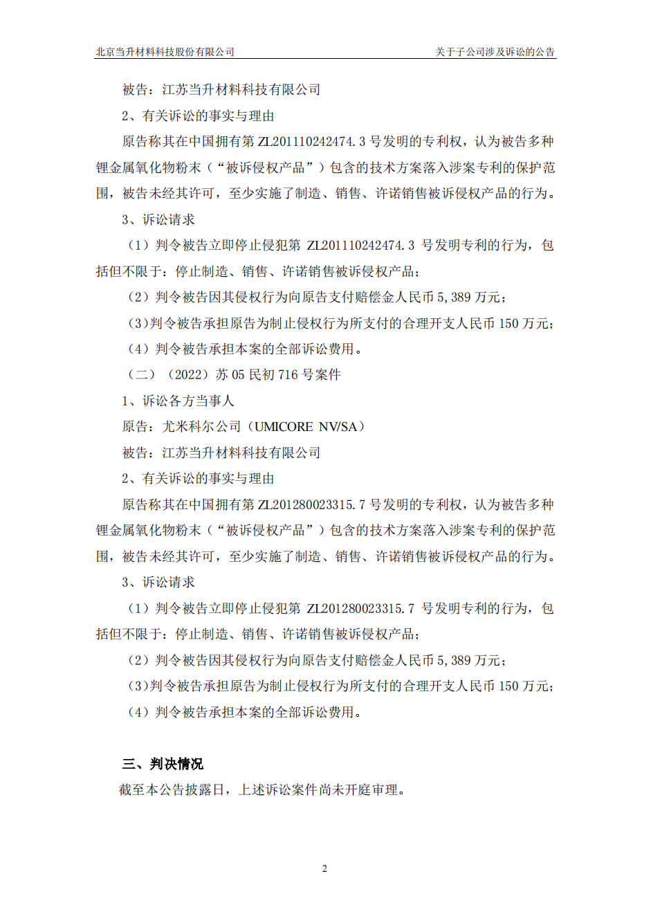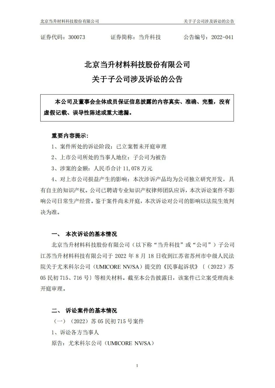 公告中稱,北京當升材料科技股份有限公司子公司江蘇當升材料科技有限公司于2022年8月18日收到江蘇省蘇州市中級人民法院關(guān)于尤米科爾公司提交的《民事起訴狀》〔(2022)蘇 05 民初 715、716 號〕等相關(guān)材料。截至本公告披露日,該案件已立案受理尚未開庭審理。