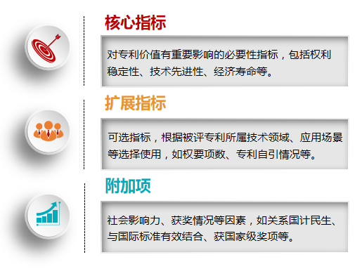 該指引對(duì)于專利價(jià)值分析評(píng)估指標(biāo)進(jìn)行了優(yōu)化,除卻27項(xiàng)核心指標(biāo)外,增加了若干項(xiàng)擴(kuò)展指標(biāo),以及設(shè)立附加項(xiàng)。其中,核心指標(biāo)指對(duì)專利價(jià)值有重要影響的必要性指標(biāo);擴(kuò)展指標(biāo)為可選指標(biāo),根據(jù)被評(píng)專利所屬技術(shù)領(lǐng)域、應(yīng)用場(chǎng)景等選擇使用;附加項(xiàng)指標(biāo)主要包括專利是否為關(guān)鍵領(lǐng)域核心技術(shù)攻關(guān)等重大創(chuàng)新成果,是否為標(biāo)準(zhǔn)必要專利等對(duì)產(chǎn)業(yè)具有控制力的核心專利,是否獲得國(guó)家級(jí)科技或?qū)@?jiǎng)項(xiàng)等指標(biāo)。