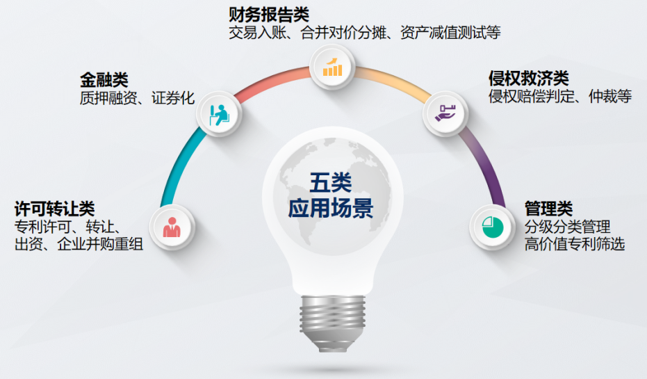 專利評(píng)估的應(yīng)用場(chǎng)景具體涉及五大類:1)許可轉(zhuǎn)讓類,包括專利許可、專利轉(zhuǎn)讓、專利出資、企業(yè)并購(gòu)重組等;2)金融類,包括專利質(zhì)押融資、專利證券化等;3)財(cái)務(wù)報(bào)告類,包括知識(shí)產(chǎn)權(quán)交易入賬、合并對(duì)價(jià)分?jǐn)?、資產(chǎn)減值測(cè)試等;4)侵權(quán)救濟(jì)類,包括侵權(quán)賠償判定、仲裁等;5)管理類,主要涉及專利分級(jí)分類管理,其中高價(jià)值專利篩選為常見(jiàn)情形。