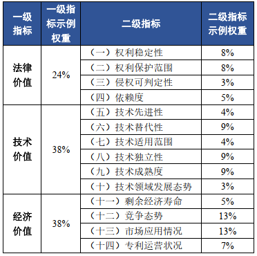 指引還以示例的形式給出某些具體場(chǎng)景下,如何利用層次分析法,根據(jù)各指標(biāo)間的相互重要程度進(jìn)行賦值來(lái)調(diào)節(jié)各指標(biāo)的權(quán)重。如,專利轉(zhuǎn)讓場(chǎng)景下,根據(jù)專家經(jīng)驗(yàn),適當(dāng)調(diào)高技術(shù)價(jià)值和經(jīng)濟(jì)價(jià)值的權(quán)重,具體各指標(biāo)權(quán)重示例如下: