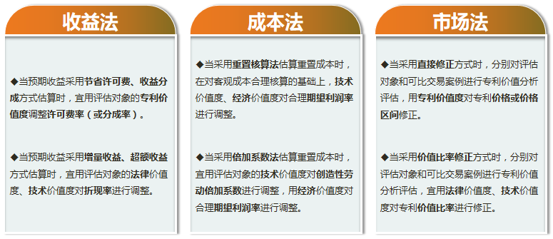 將專利價(jià)值度作為調(diào)節(jié)系數(shù)或參數(shù),應(yīng)用于收益法、成本法、市場(chǎng)法三種資產(chǎn)評(píng)估基本方法及其衍生方法,具體使用時(shí)應(yīng)考慮分析專利價(jià)值分析評(píng)估指標(biāo)與資產(chǎn)評(píng)估因素的關(guān)聯(lián)關(guān)系,合理選擇所需指標(biāo)和因素,避免重復(fù)計(jì)算。具體如下圖所示: