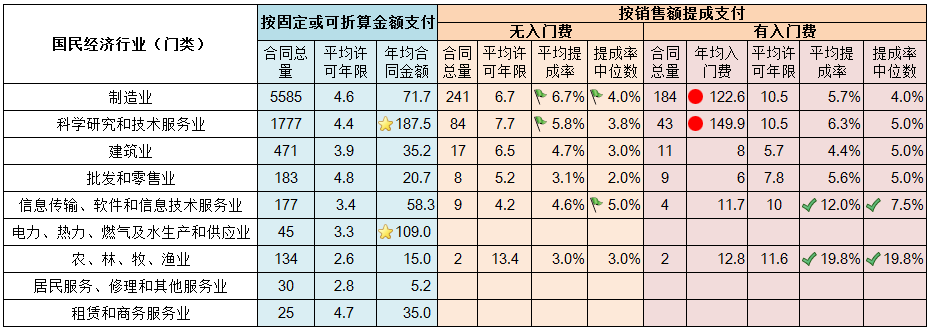 目前以5年為一個(gè)統(tǒng)計(jì)周期,2022年已發(fā)布2017-2021年相關(guān)統(tǒng)計(jì)數(shù)據(jù),下表選取其中部分?jǐn)?shù)據(jù)主要展示國(guó)民經(jīng)濟(jì)行業(yè)重點(diǎn)門類所涉及的按固定或可折算金額支付、按銷售額提成支付兩種類型的專利實(shí)施許可使用費(fèi)率情況,表中各欄目下對(duì)應(yīng)金額或提成率最高的兩個(gè)行業(yè)分別用不同標(biāo)記示出。