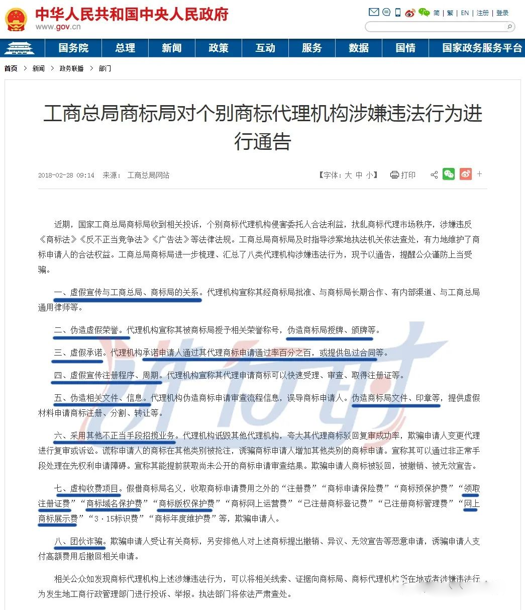 早在2018年2月,商標局網(wǎng)站也發(fā)布了8類代理機構涉嫌違法行為