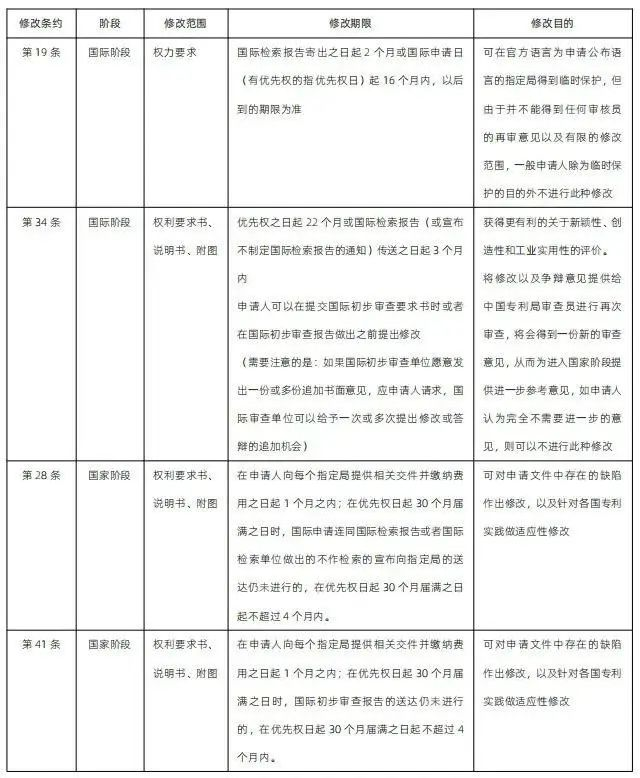 進(jìn)入國家階段后,可以按照PCT條約第28條和第41條,分別向指定局和選定局提出權(quán)利要求書、說明書和附圖的修改。
