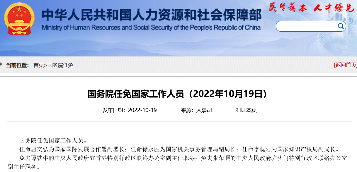 國務(wù)院任免國家工作人員(2022年10月19日)