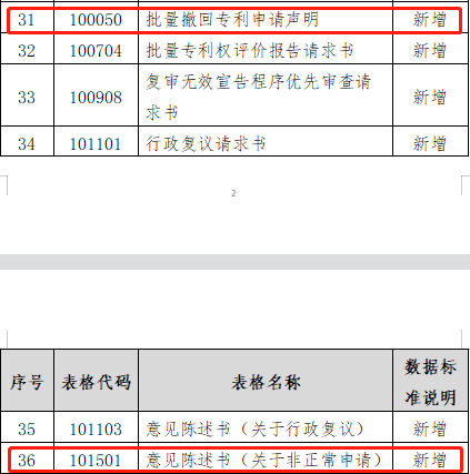 近日,國家知識產權局網站發(fā)布??《關于發(fā)布修訂版專利申請請求類表格和電子申請數(shù)據標準規(guī)范的通知》,??自2023年1月11日起啟用!在修訂和新增的表格中,新增了意見陳述書(關于非正常申請)和批量撤回專利申請聲明。
