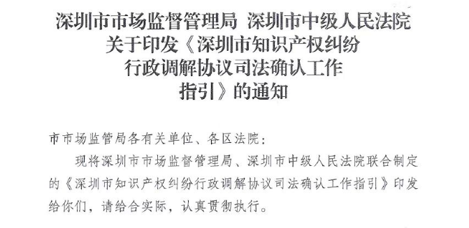 近日,深圳市市場(chǎng)監(jiān)管局 (深圳市知識(shí)產(chǎn)權(quán)局) 與深圳市中級(jí)人民法院聯(lián)合制定并印發(fā)了 《深圳市知識(shí)產(chǎn)權(quán)糾紛行政調(diào)解協(xié)議 司法確認(rèn)工作指引》 (以下簡稱《工作指引》) 進(jìn)一步對(duì)司法確認(rèn)相關(guān)事項(xiàng) 予以細(xì)化和明確 為深圳市知識(shí)產(chǎn)權(quán)糾紛行政調(diào)解協(xié)議 司法確認(rèn)辦理提供標(biāo)準(zhǔn)化和規(guī)范化指引 推動(dòng)知識(shí)產(chǎn)權(quán)糾紛高效、多元化解
