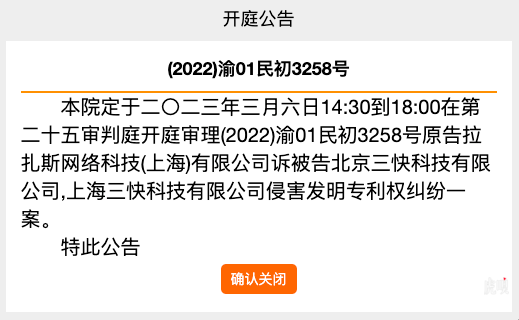 ??重慶法院公眾服務(wù)網(wǎng)顯示,拉扎斯網(wǎng)絡(luò)科技(上海)有限公司與北京三快科技有限公司、上海三快科技有限公司相關(guān)侵害發(fā)明專利權(quán)糾紛一案定于3月6日開庭,
