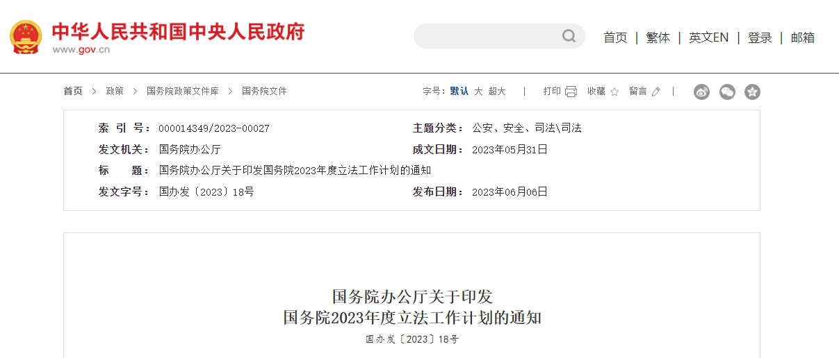 國(guó)務(wù)院辦公廳關(guān)于印發(fā)國(guó)務(wù)院2023年度立法工作計(jì)劃的通知