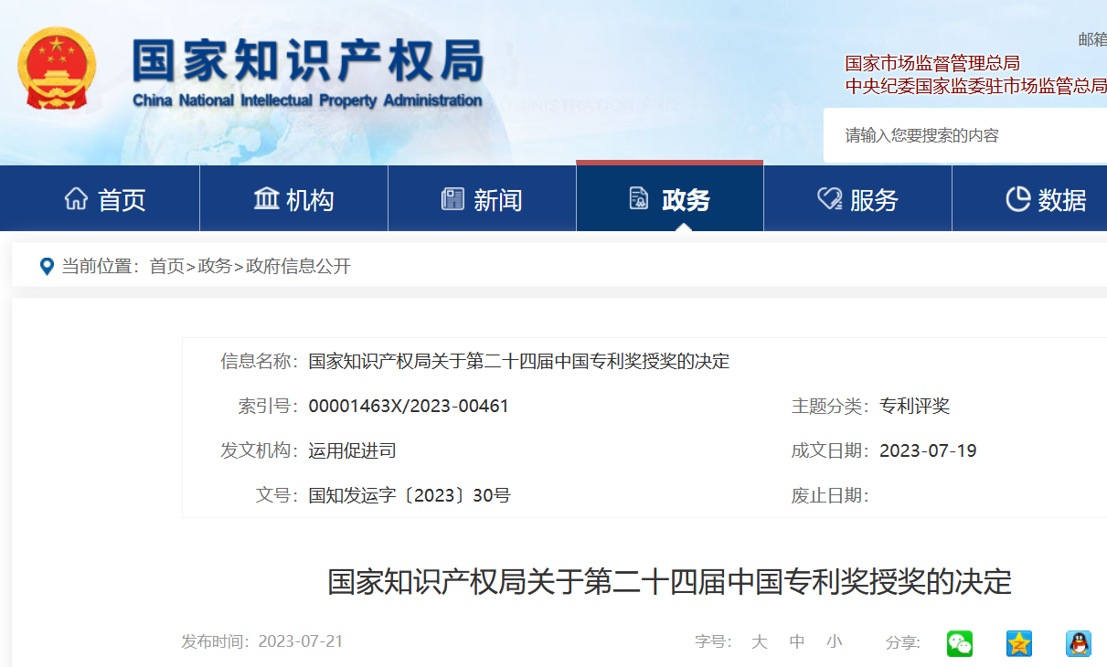 國家知識產(chǎn)權(quán)局關(guān)于第二十四屆中國專利獎授獎的決定