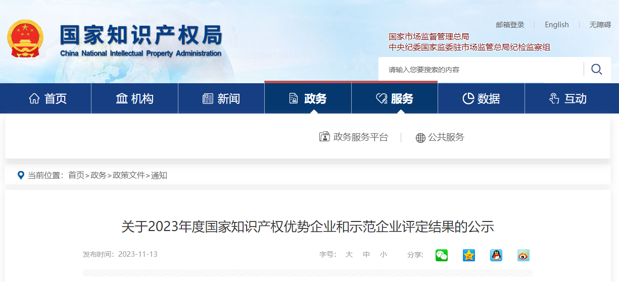 國知局:2023年度國家知識產(chǎn)權(quán)優(yōu)勢企業(yè)和示范企業(yè)評定結(jié)果公示