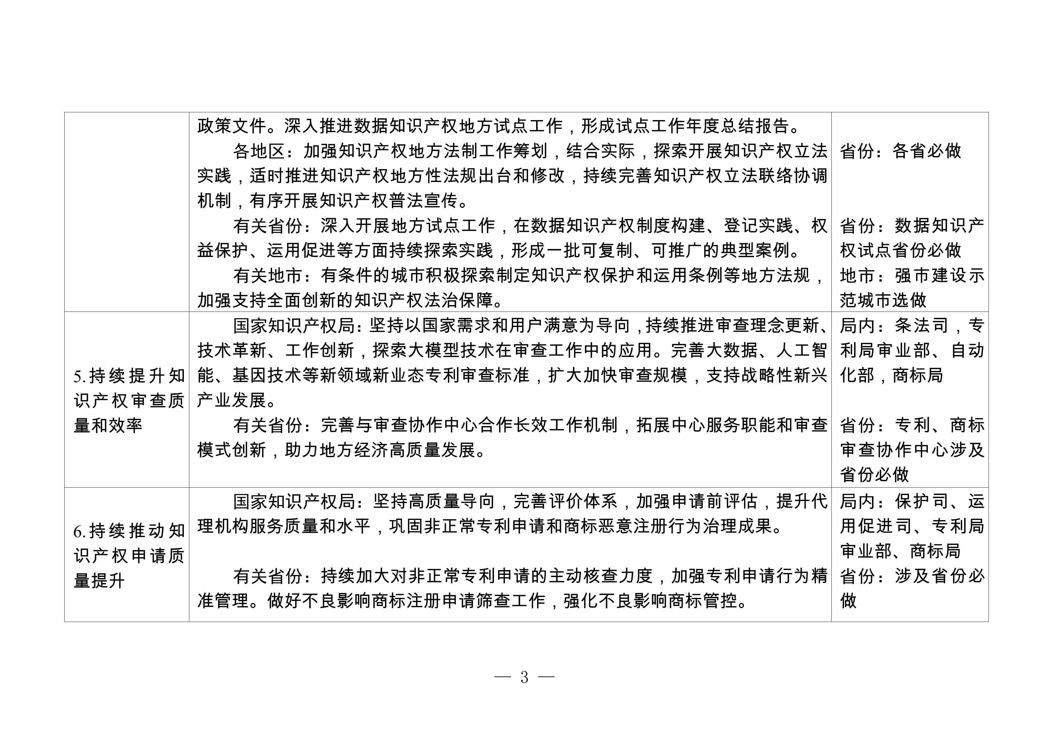 (五)加強(qiáng)法治保障和宏觀政策供給。大力推進(jìn)法治建設(shè),深入宣傳貫徹新修改的《中華人民共和國(guó)專(zhuān)利法實(shí)施細(xì)則》和《專(zhuān)利審查指南》。加快推進(jìn)商標(biāo)法及其實(shí)施條例新一輪修訂、地理標(biāo)志專(zhuān)門(mén)立法研究和《集成電路布圖設(shè)計(jì)保護(hù)條例》修改論證。有效落實(shí)《地理標(biāo)志產(chǎn)品保護(hù)辦法》和《集體商標(biāo)、證明商標(biāo)注冊(cè)和管理規(guī)定》。完成《國(guó)家知識(shí)產(chǎn)權(quán)局行政復(fù)議規(guī)程》修改。持續(xù)加強(qiáng)知識(shí)產(chǎn)權(quán)地方立法工作指導(dǎo)。(條法司負(fù)責(zé))持續(xù)推進(jìn)《商標(biāo)審查審理指南》動(dòng)態(tài)修改。(商標(biāo)局負(fù)責(zé))推動(dòng)構(gòu)建數(shù)據(jù)知識(shí)產(chǎn)權(quán)保護(hù)規(guī)則,研究制定數(shù)據(jù)知識(shí)產(chǎn)權(quán)政策文件,深化地方試點(diǎn)。(戰(zhàn)略規(guī)劃司負(fù)責(zé))加強(qiáng)知識(shí)產(chǎn)權(quán)宏觀政策供給,對(duì)具有普遍性和制度性的關(guān)鍵性問(wèn)題開(kāi)展深入分析和調(diào)查研究。圍繞知識(shí)產(chǎn)權(quán)助力打造新質(zhì)生產(chǎn)力,謀劃研究一批針對(duì)性強(qiáng)的儲(chǔ)備政策。(局機(jī)關(guān)各部門(mén)按職責(zé)分工負(fù)責(zé))