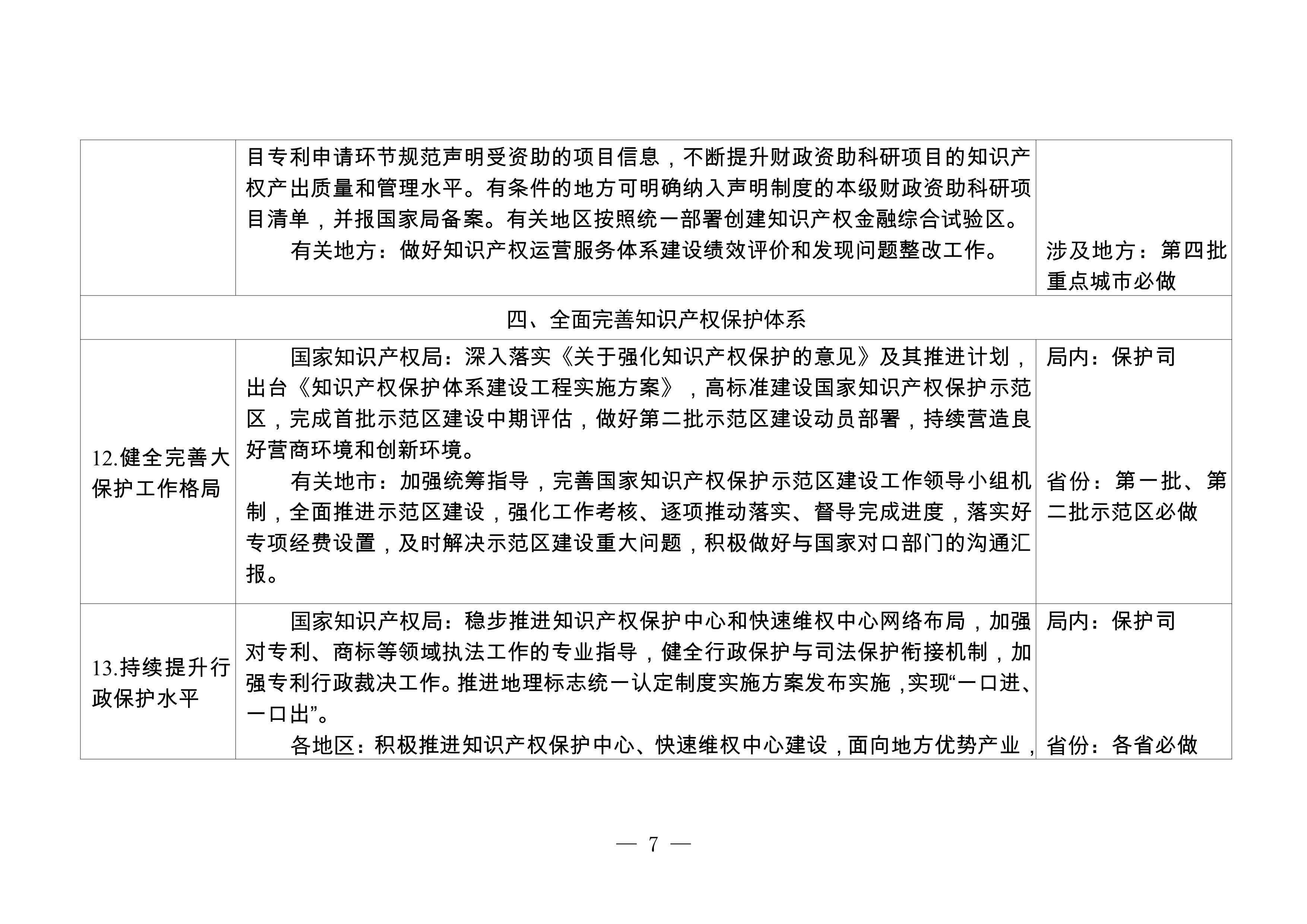 (七)健全知識(shí)產(chǎn)權(quán)保護(hù)政策。深入落實(shí)《關(guān)于強(qiáng)化知識(shí)產(chǎn)權(quán)保護(hù)的意見(jiàn)》及其推進(jìn)計(jì)劃,研究出臺(tái)《知識(shí)產(chǎn)權(quán)保護(hù)體系建設(shè)工作實(shí)施方案》。會(huì)同有關(guān)部門(mén)做好國(guó)家知識(shí)產(chǎn)權(quán)保護(hù)示范區(qū)建設(shè)工作,完成首批示范區(qū)建設(shè)中期評(píng)估,做好第二批示范區(qū)建設(shè)動(dòng)員部署。推進(jìn)完善知識(shí)產(chǎn)權(quán)快速協(xié)同保護(hù)體系,有序新建一批國(guó)家級(jí)知識(shí)產(chǎn)權(quán)保護(hù)中心和快速維權(quán)中心。推進(jìn)知識(shí)產(chǎn)權(quán)糾紛快速處理試點(diǎn)工作。研究制定專(zhuān)利糾紛行政裁決和調(diào)解辦法,加強(qiáng)重大專(zhuān)利侵權(quán)糾紛和藥品專(zhuān)利糾紛早期解決機(jī)制行政裁決辦案工作。研究制定關(guān)于加強(qiáng)涉外知識(shí)產(chǎn)權(quán)保護(hù)工作的意見(jiàn)。啟動(dòng)實(shí)施地理標(biāo)志保護(hù)工程,推進(jìn)地理標(biāo)志統(tǒng)一認(rèn)定制度實(shí)施方案發(fā)布實(shí)施。(保護(hù)司負(fù)責(zé))