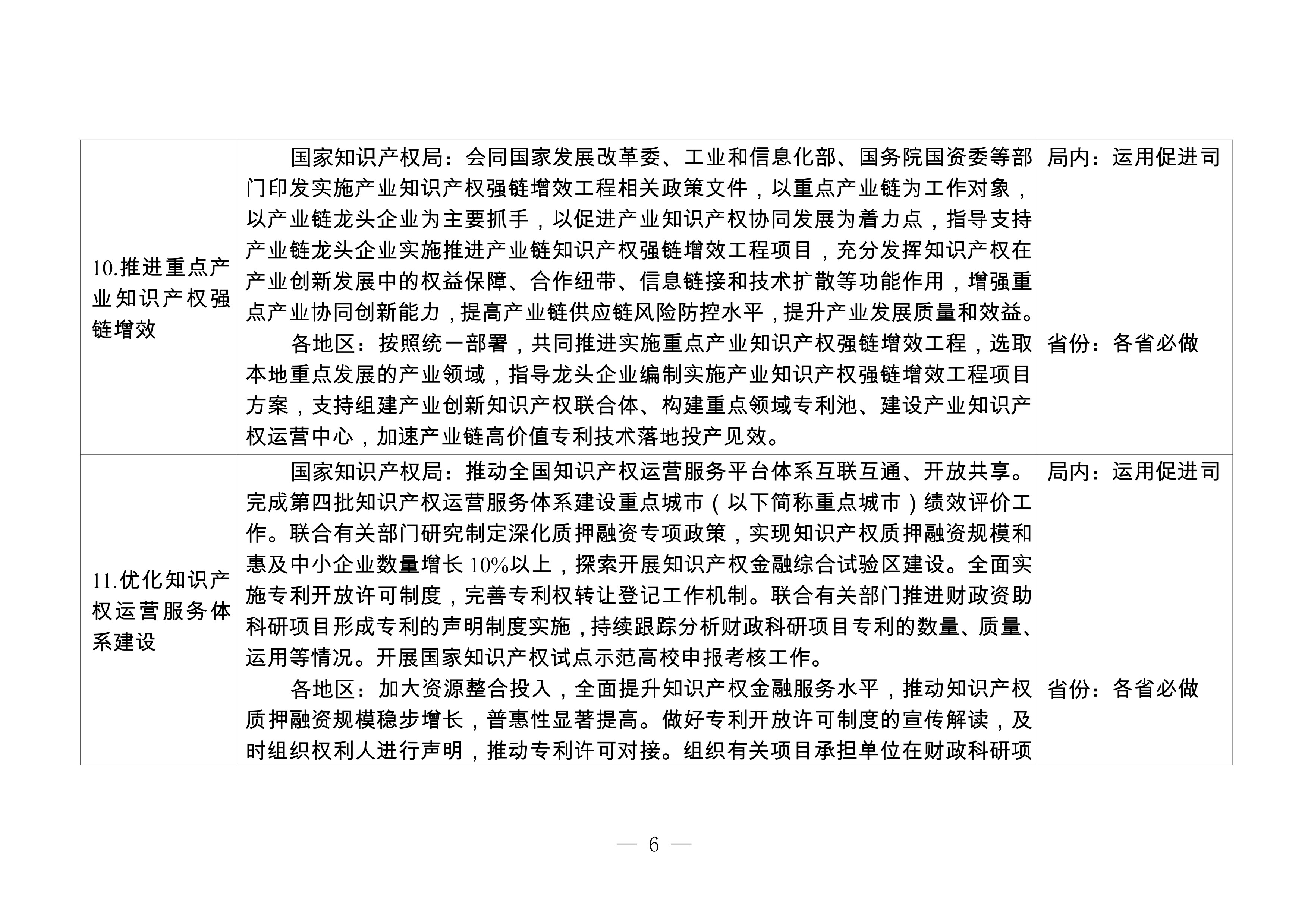 ——知識(shí)產(chǎn)權(quán)運(yùn)用。全面推進(jìn)專(zhuān)利轉(zhuǎn)化運(yùn)用專(zhuān)項(xiàng)行動(dòng),力爭(zhēng)年底前實(shí)現(xiàn)全國(guó)高校和科研機(jī)構(gòu)未轉(zhuǎn)化有效專(zhuān)利盤(pán)點(diǎn)全覆蓋,一批高價(jià)值專(zhuān)利實(shí)現(xiàn)快速轉(zhuǎn)化,知識(shí)產(chǎn)權(quán)質(zhì)押融資規(guī)模和惠及中小企業(yè)數(shù)量增長(zhǎng)10%以上,全國(guó)專(zhuān)利密集型產(chǎn)業(yè)增加值占國(guó)內(nèi)生產(chǎn)總值比重穩(wěn)步提高。