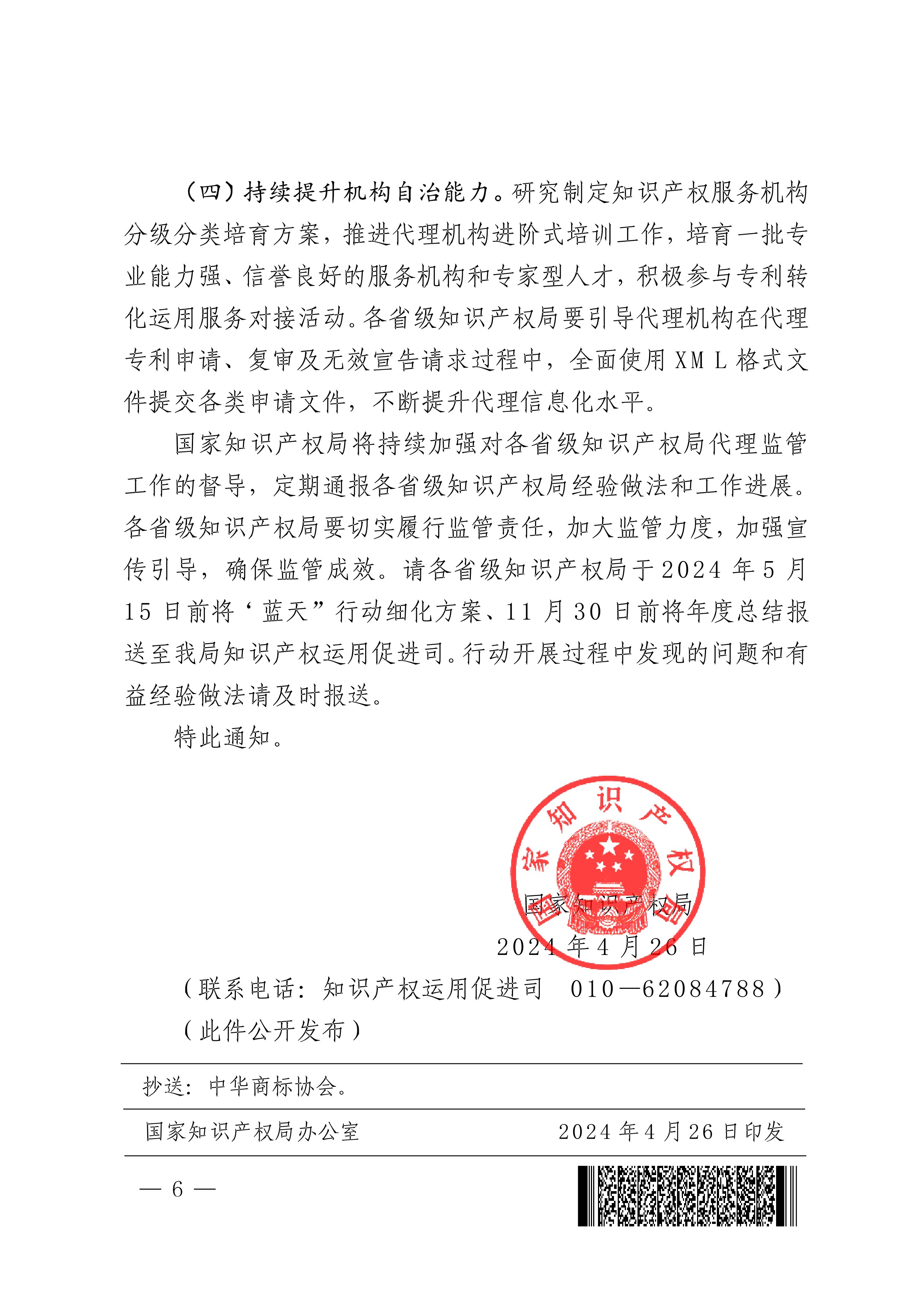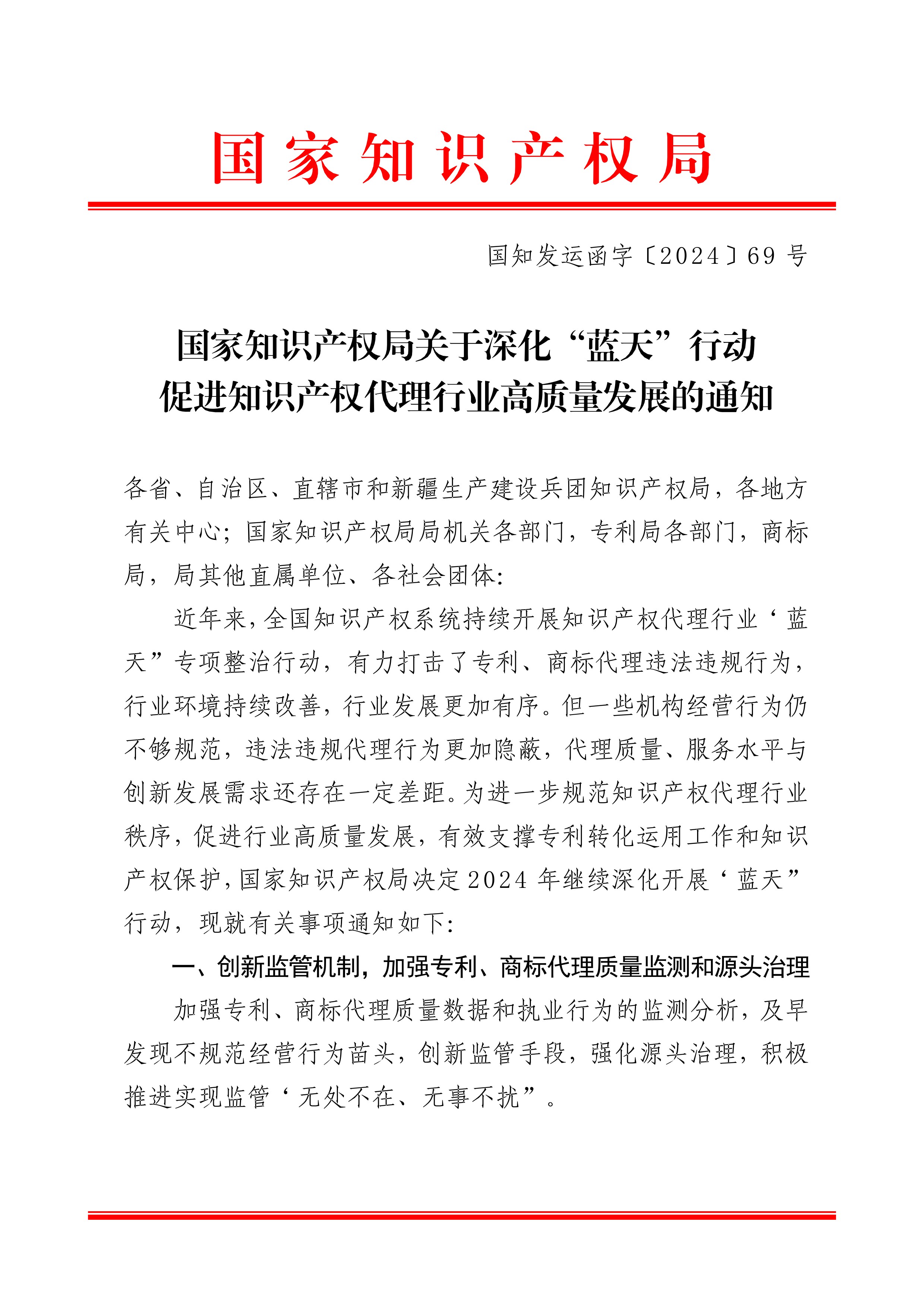 國家知識產(chǎn)權(quán)局關(guān)于深化“藍(lán)天”行動促進(jìn)知識產(chǎn)權(quán)代理行業(yè)高質(zhì)最發(fā)展的通知