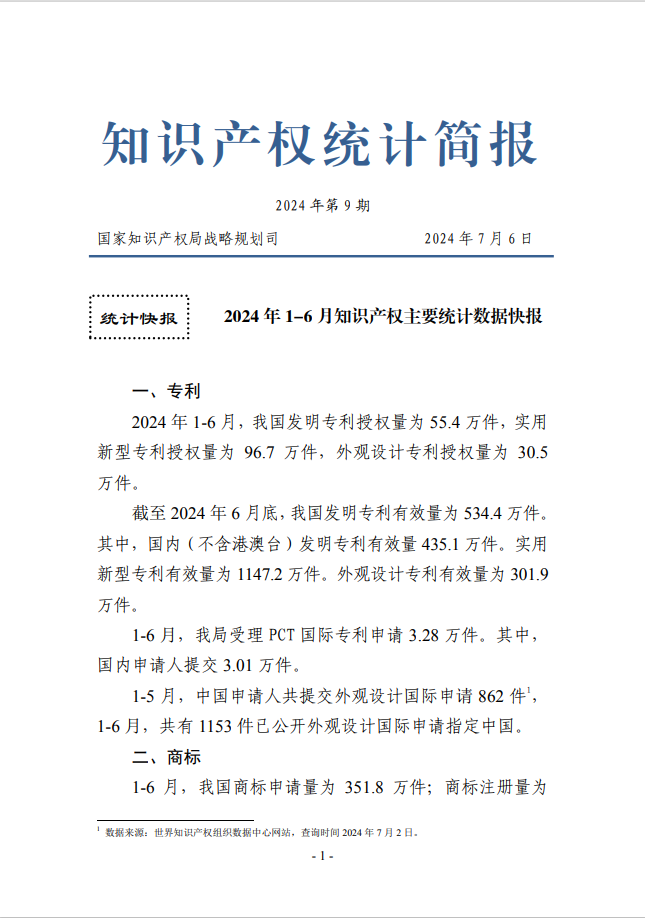 2024年1-6月知識(shí)產(chǎn)權(quán)主要統(tǒng)計(jì)數(shù)據(jù)快報(bào)