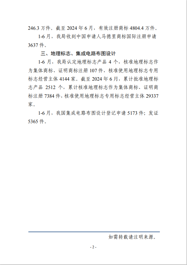 “2024年1-6月,我國(guó)發(fā)明專利授權(quán)量為55.4萬(wàn)件,國(guó)家知識(shí)產(chǎn)權(quán)局受理PCT國(guó)際專利申請(qǐng)3.28萬(wàn)件。截至2024年6月底,我國(guó)發(fā)明專利有效量為534.4萬(wàn)件。1-6月,我國(guó)商標(biāo)申請(qǐng)量為351.8萬(wàn)件;認(rèn)定地理標(biāo)志產(chǎn)品4個(gè),核準(zhǔn)地理標(biāo)志作為集體商標(biāo)、證明商標(biāo)注冊(cè)107件,核準(zhǔn)使用地理標(biāo)志專用標(biāo)志經(jīng)營(yíng)主體4144家。”