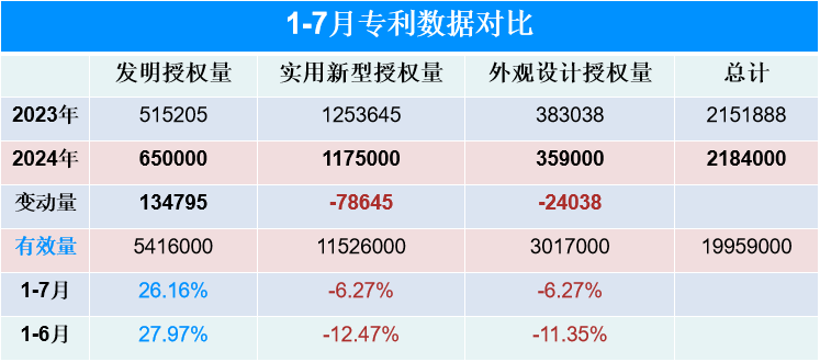 近日,國(guó)知局公布2024年1-7月知識(shí)產(chǎn)權(quán)主要統(tǒng)計(jì)數(shù)據(jù)與2023年同期對(duì)比: